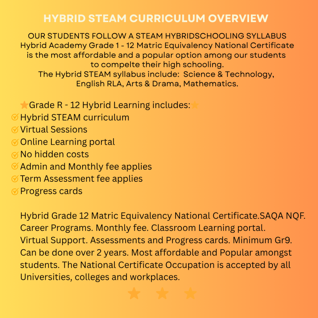 HybridAcademy.org began in 2013 when Hester started her career as a Mental Health Therapist which led to what we have today, Hybrid Academy Grade 1 – Grade 12 and National Certificates. Hybrid Syllabi is ideal for students that prefer an alternative to mainstream schooling with a focus on a STEAM (Science, Tech, English, Art, Math) inclusive education curriculum. Hybrid Academy Grade 12 National Certificate Occupation Matric Equivalent exit Accredited by SQAQ and accepted by all universities and workplaces!
